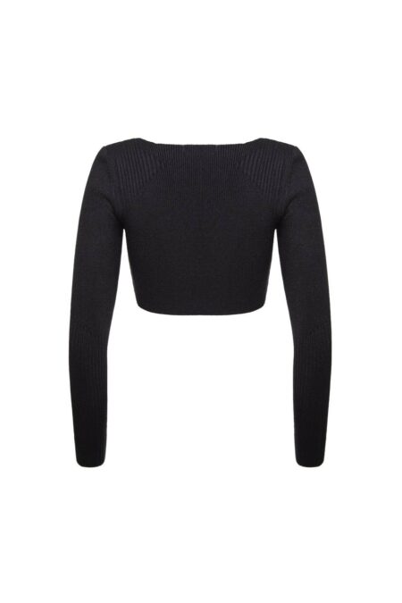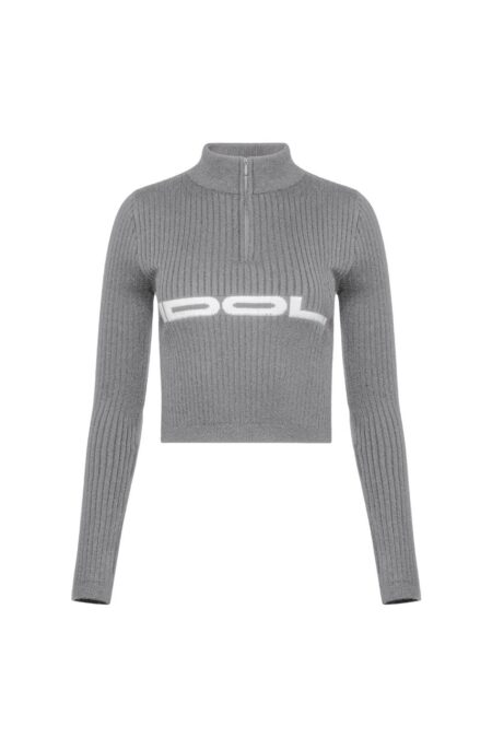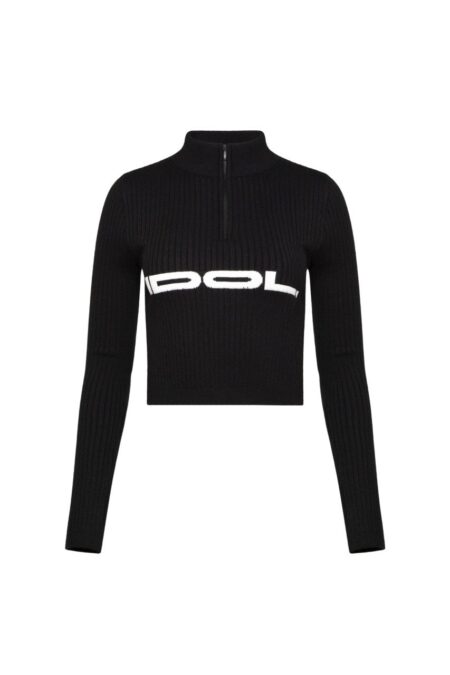 2800,00 ₴Вкорочений трикотажний джемпер з довгим рукавом, виконаний із бавовняного полотна у рубчик. Модель із коміром-стійкою та короткою застібкою-блискавкою. На передній частині — контрастний напис IDOL. Задня частина — без декору.