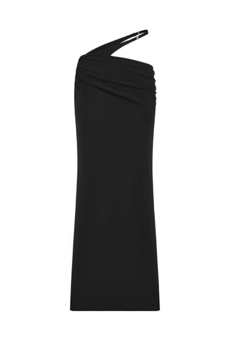 3500,00 ₴Асиметрична спідниця довжини максі, виконана з еластичного біфлексу, що щільно облягає тіло та створює виразний силует. Модель має фіксацію на одну сторону з декоративною бретелею, а драпування в зоні талії додає глибини й акцентує фігуру. Еластична тканина забезпечує комфорт у носінні, зберігаючи при цьому форму та щільність.