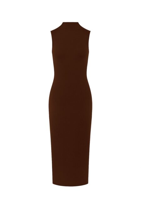 4900,00 ₴Лаконічна в’язана сукня довжини міді з високою горловиною. Модель без рукавів із приталеним силуетом і елегантним обляганням по фігурі. Виготовлена з м’якої еластичної віскозної пряжі.