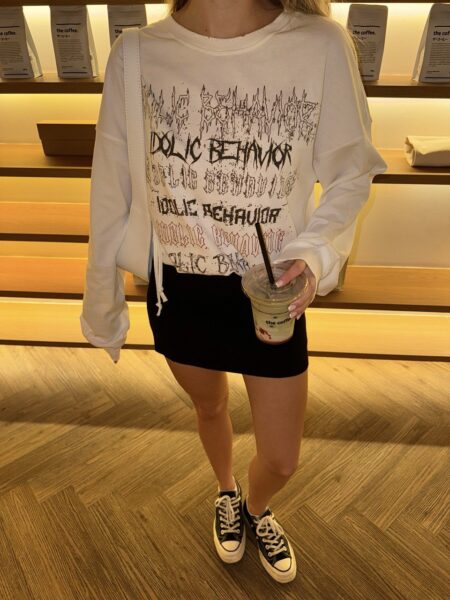 2200,00 ₴Оригінальна ціна: 2200,00 ₴.1650,00 ₴Поточна ціна: 1650,00 ₴.Бавовняний лонгслів вільного крою з округлою горловиною та довгими рукавами. На передній частині розміщено багаторядковий принт із написом “Idolic Behavior” у різних стилях шрифтів. Задня частина – без декору.
