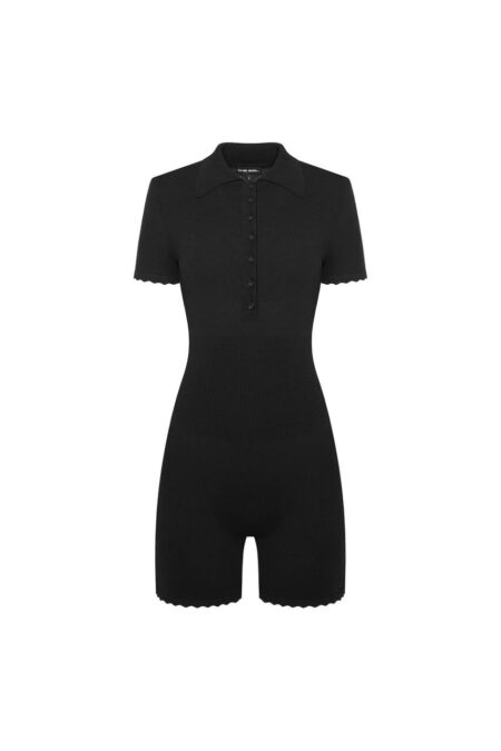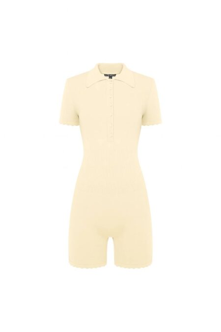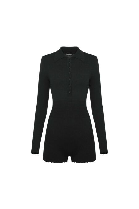 4900,00 ₴Трикотажний комбінезон з довгим рукавом, виготовлений із м’якої віскозної пряжі. Модель має акцентну талію з еластичною резинкою. Верх виконаний у вигляді сорочки-поло з відкладним коміром і ґудзиковою планкою. Додаткову структуру та силу додають підплічники. Низ оформлений у вигляді облягаючих шортів з фігурним краєм.