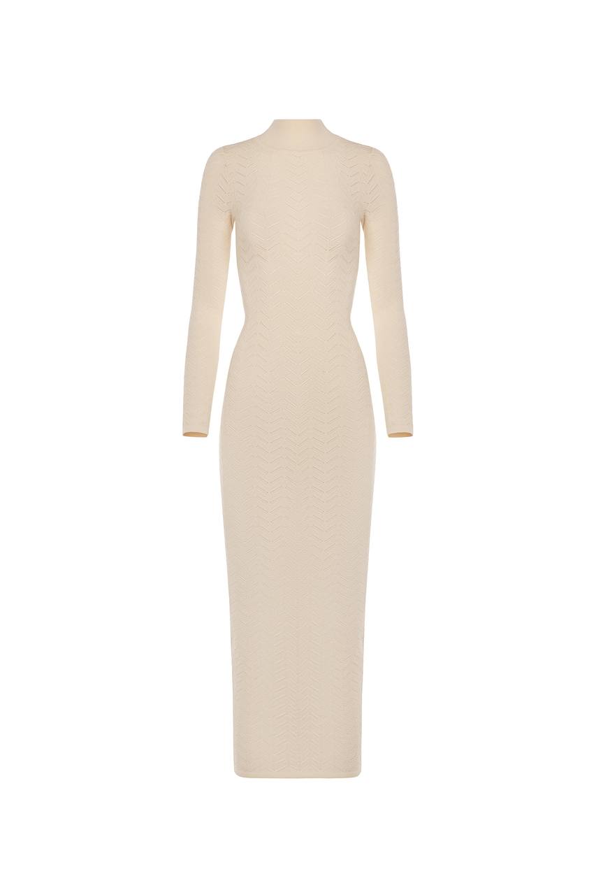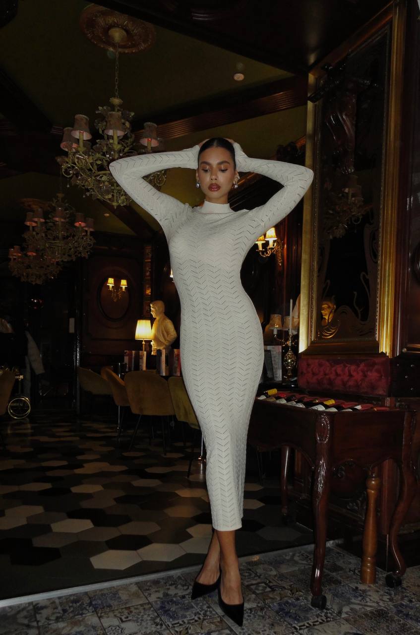 В’язана сукня максі довжини з елегантним ажурним візерунком. Виконана з м’якої еластичної пряжі, яка делікатно підкреслює силует. Модель із довгими рукавами та високою горловиною створює вишуканий образ. Має напівпрозору структуру, що надає легкості та ідеально підходить для вечірніх виходів або стильних святкових луків.