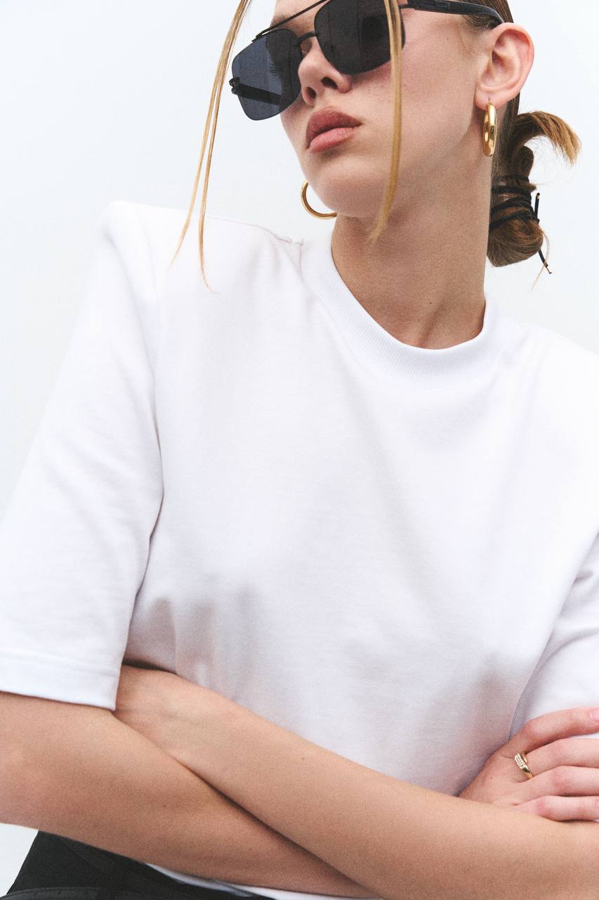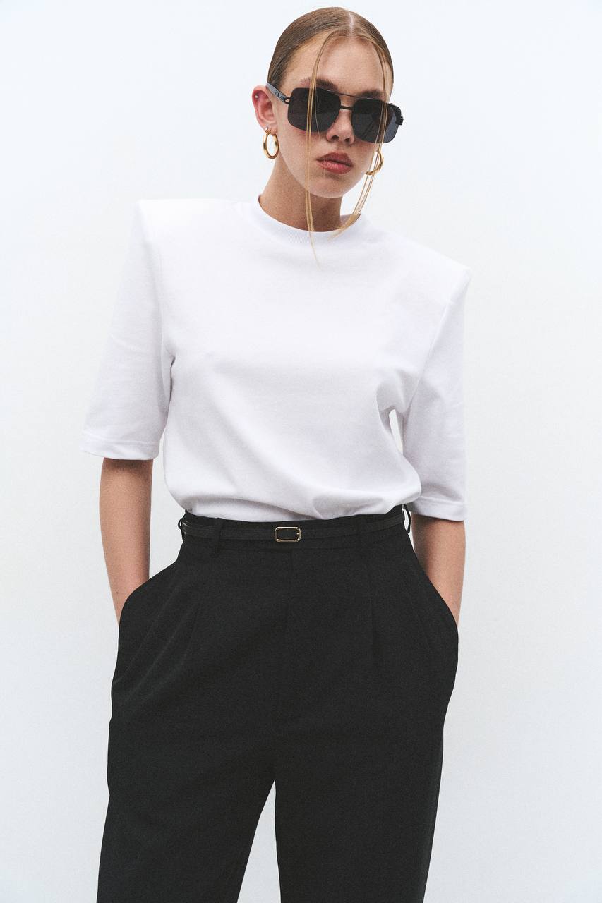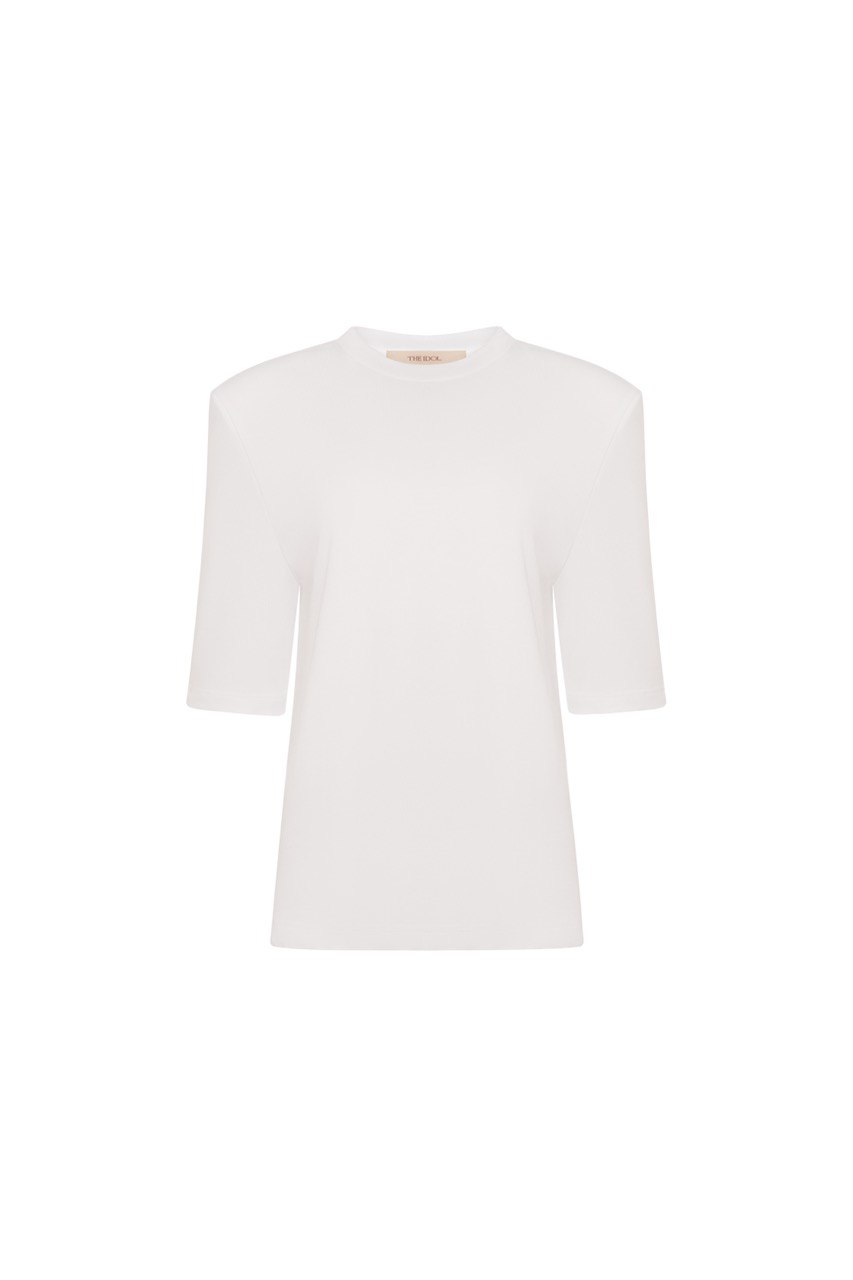 Біла базова футболка з виразним акцентом на плечах завдяки вшитим підплічникам. Модель має прямий силует та напівоблягаючу посадку, що підкреслює лінію плечей і створює візуально врівноважений образ. Кругла горловина та видовжений короткий рукав надають виробу лаконічності та актуальності.