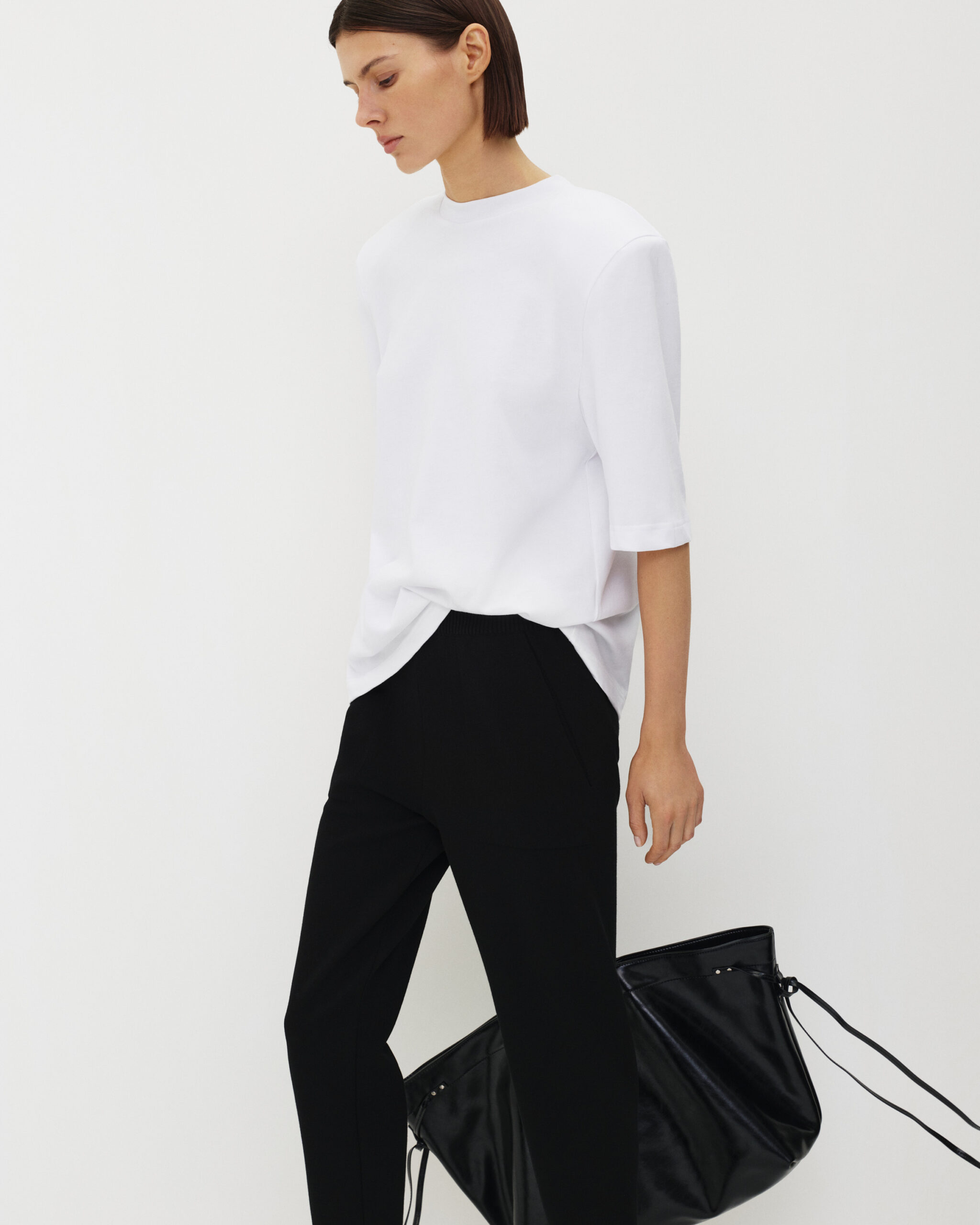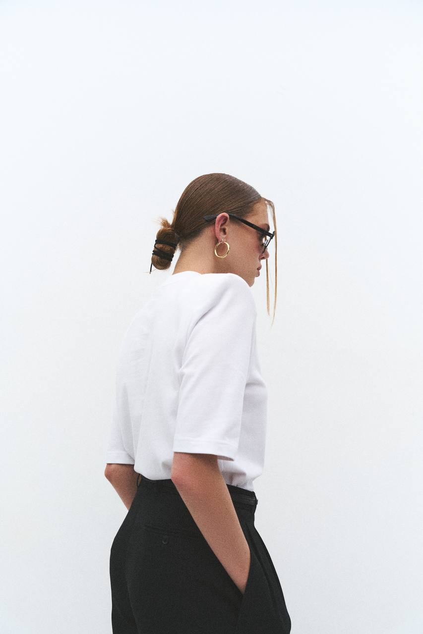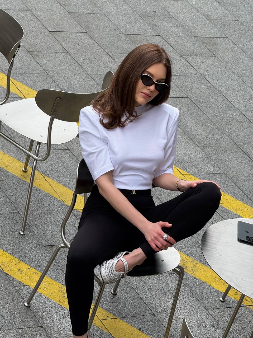 Біла базова футболка з виразним акцентом на плечах завдяки вшитим підплічникам. Модель має прямий силует та напівоблягаючу посадку, що підкреслює лінію плечей і створює візуально врівноважений образ. Кругла горловина та видовжений короткий рукав надають виробу лаконічності та актуальності.